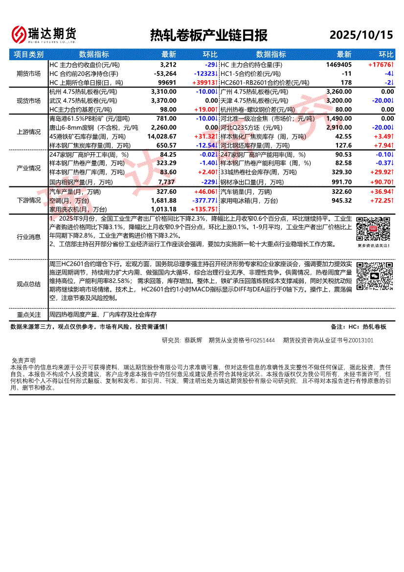 瑞达期货-热轧卷板市场周报:产量维持高位,热卷期价反弹承压-251010