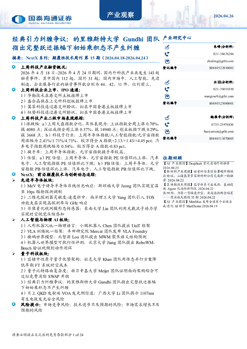 国泰海通证券-产业观察:经典引力纠缠争议,的里雅斯特大学Gundhi团队指出完整跃迁振幅下初始乘积态不产生纠缠-260426