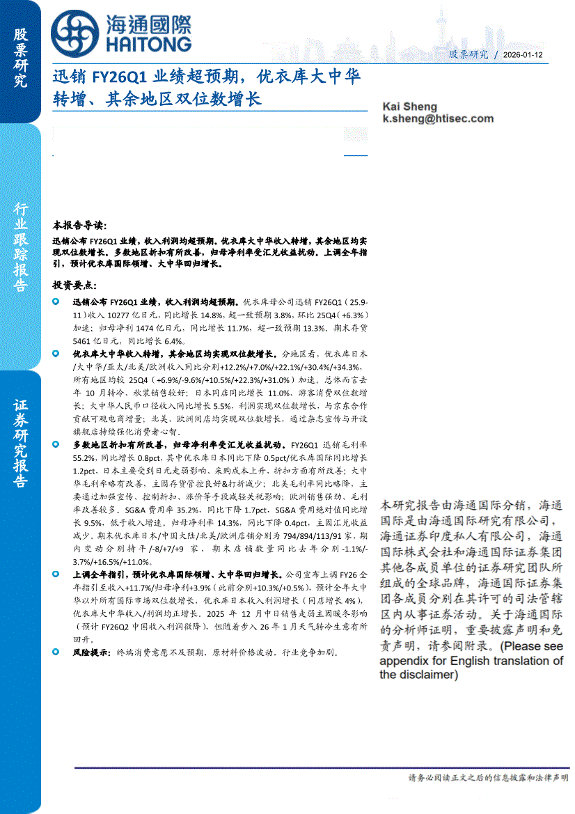 纺织服装行业:海通国际-纺织服装行业:迅销FY26Q1业绩超预期,优衣库大中华转增、其余地区双位数增长-260112