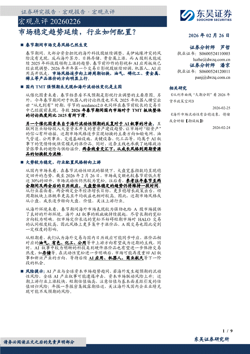 东吴证券-宏观点评:市场稳定趋势延续,行业如何配置?-260226