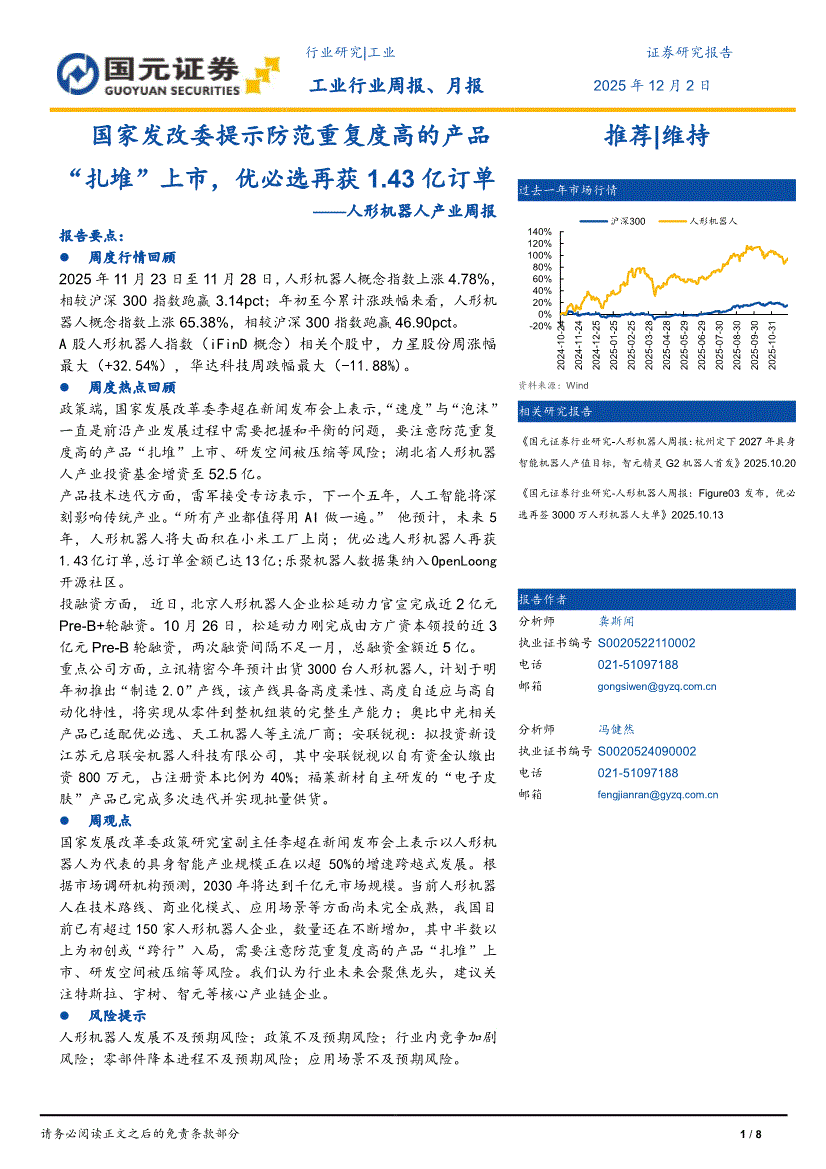 人形机器人行业:国元证券-人形机器人产业周报:国家发改委提示防范重复度高的产品“扎堆”上市,优必选再获1.43亿订单-251202
