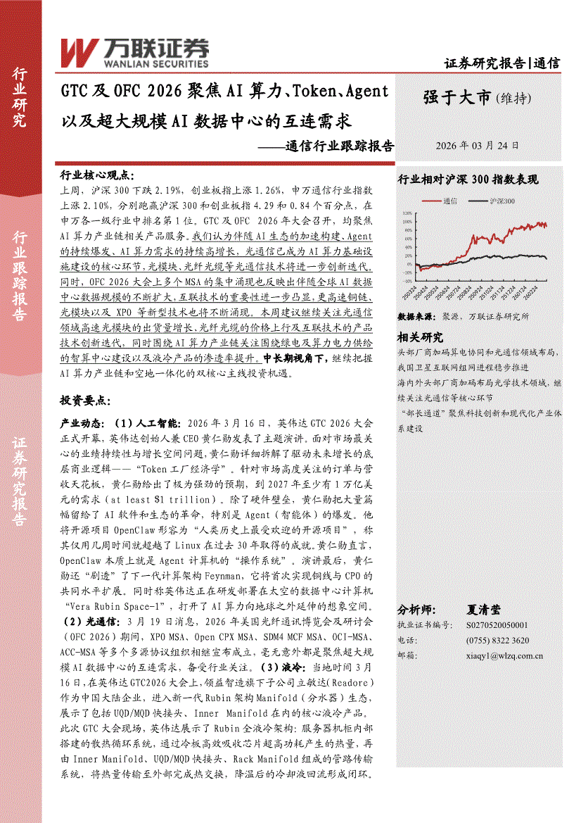 通信行业:万联证券-通信行业跟踪报告:GTC及OFC 2026聚焦AI算力、Token、Agent以及超大规模AI数据中心的互连需求-260324