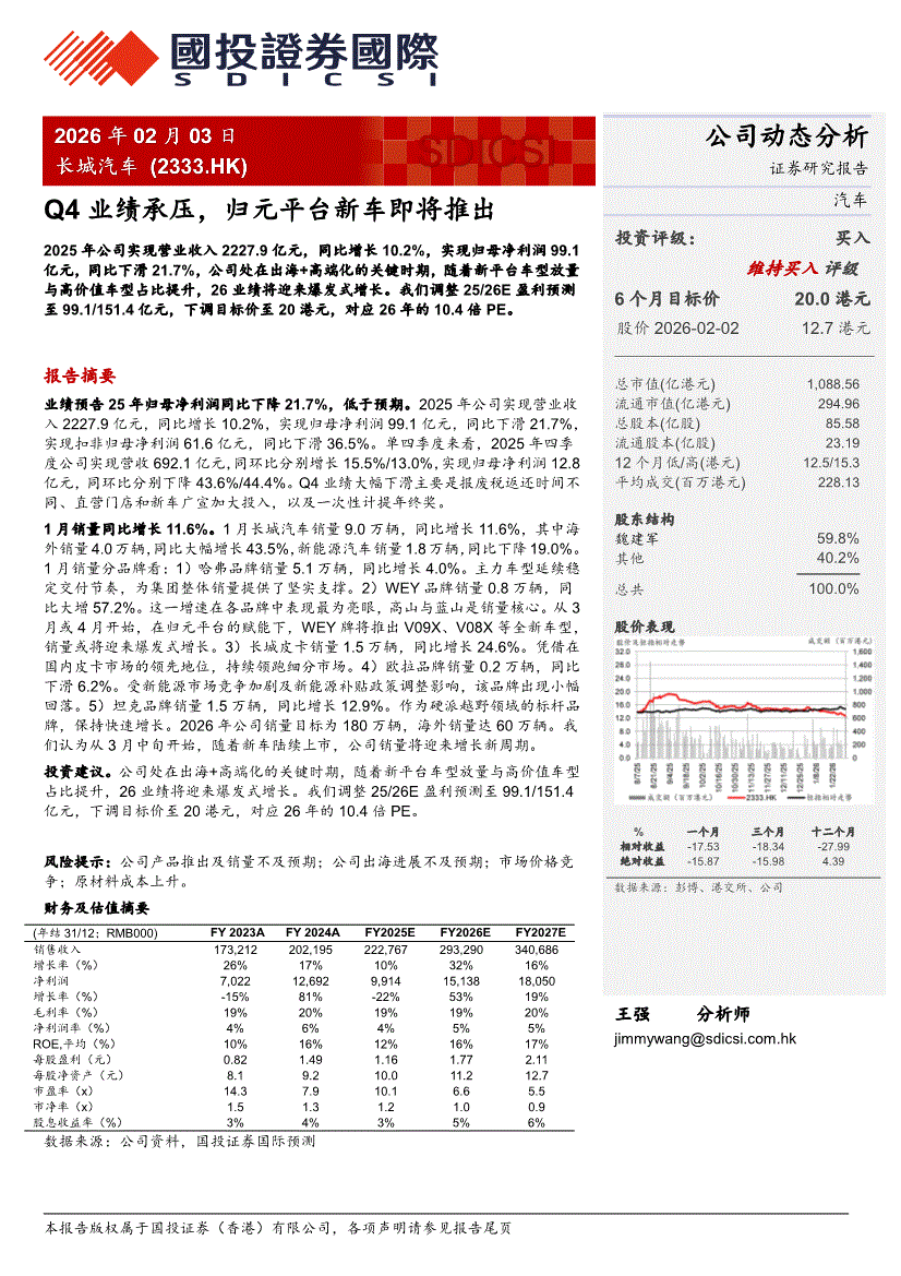 长城汽车:国投证券国际-长城汽车-2333.HK-Q4业绩承压,归元平台新车即将推出-260203