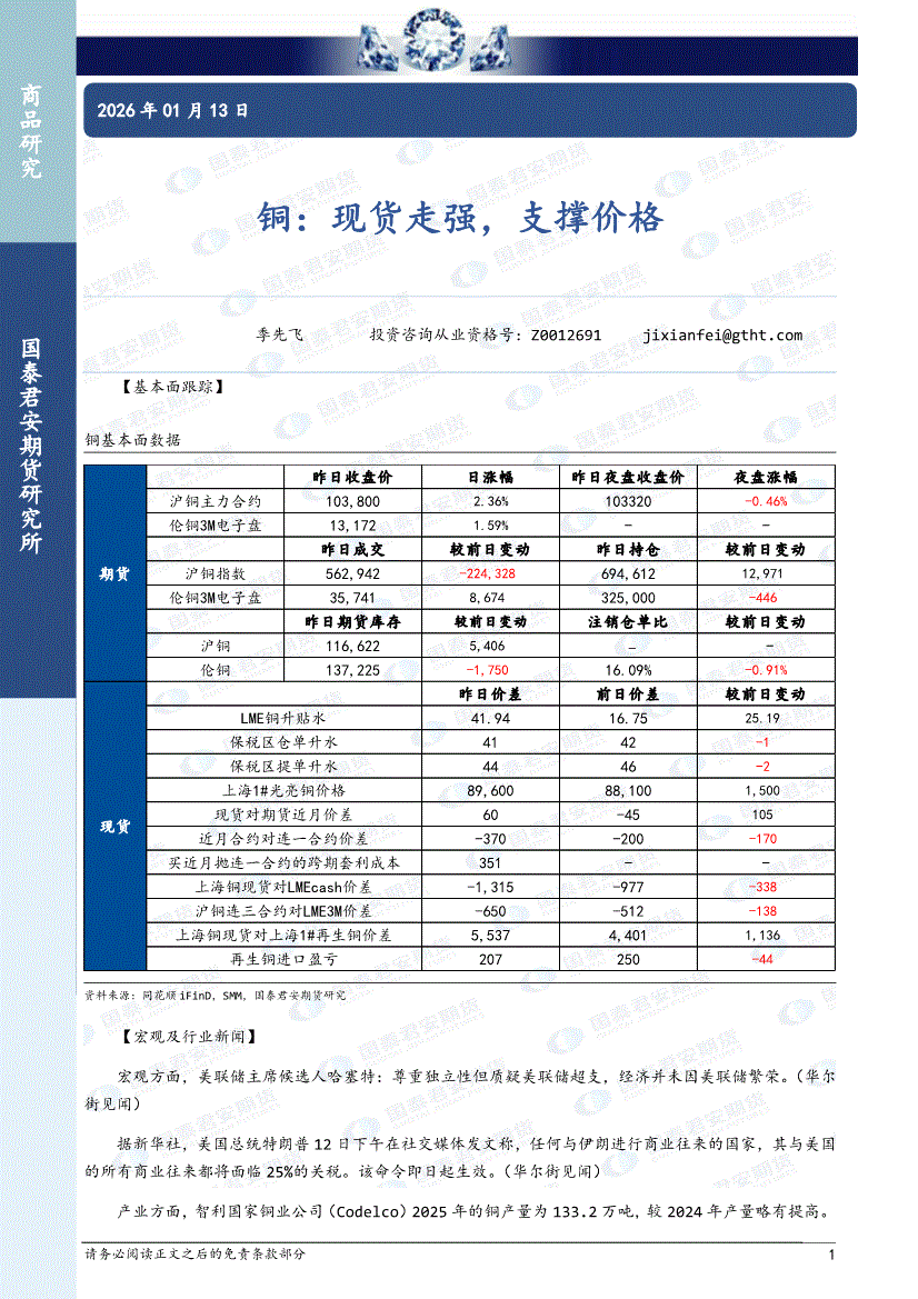 国泰君安期货-铜:现货走强,支撑价格-260113