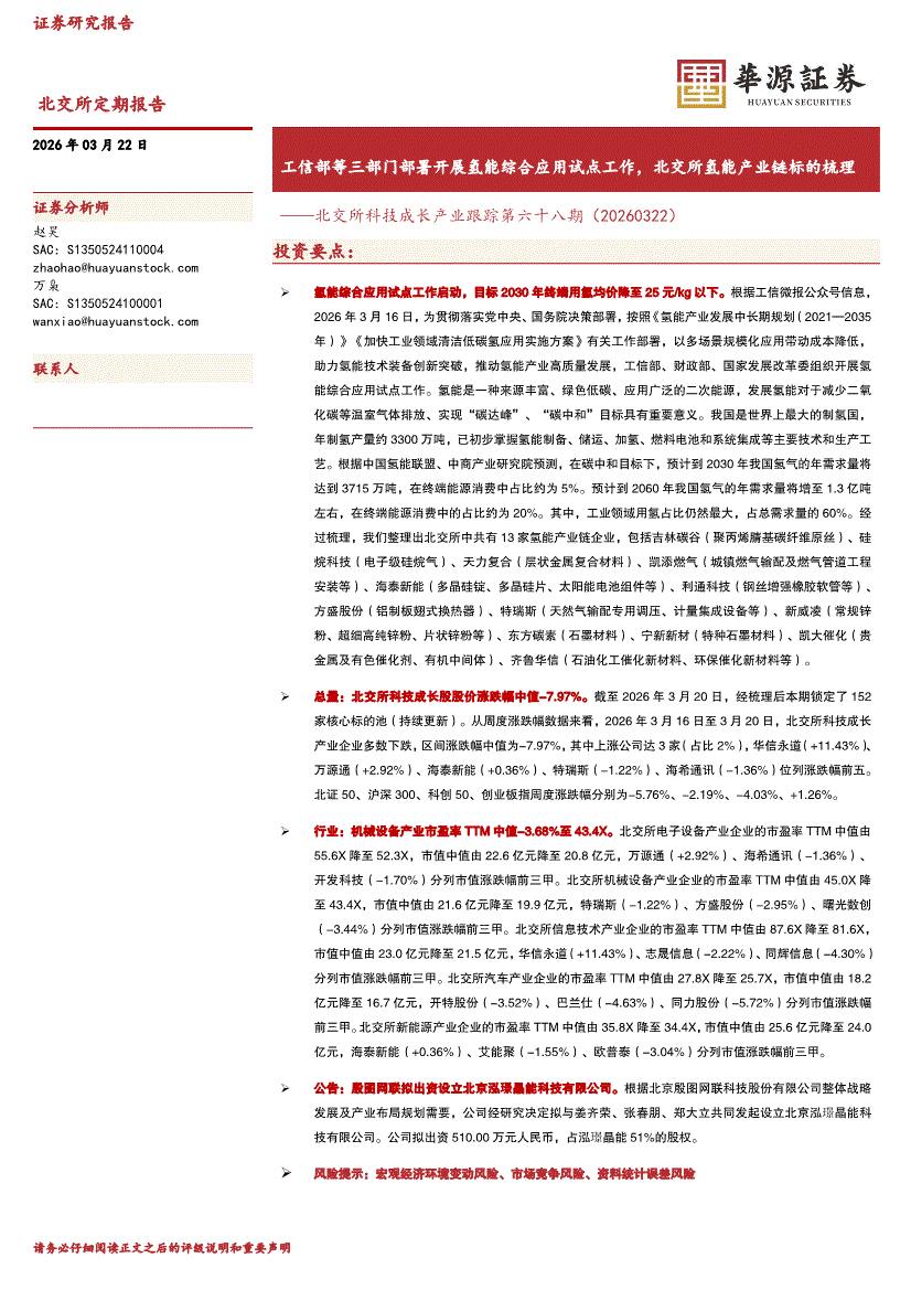 华源证券-北交所科技成长产业跟踪第六十八期:工信部等三部门部署开展氢能综合应用试点工作,北交所氢能产业链标的梳理-260322