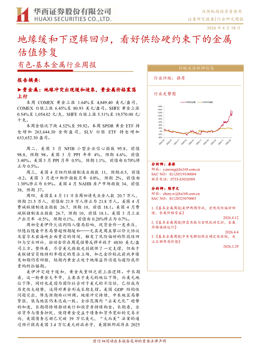 有色~基本金属行业:华西证券-有色~基本金属行业周报:地缘缓和下逻辑回归,看好供给硬约束下的金属估值修复-260418