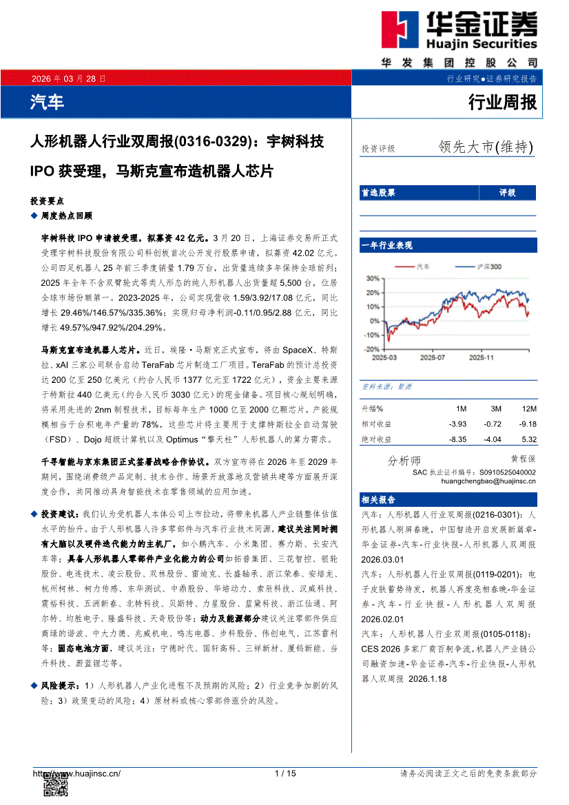 人形机器人行业:华金证券-人形机器人行业双周报(0316~0329):宇树科技IPO获受理,马斯克宣布造机器人芯片-260328