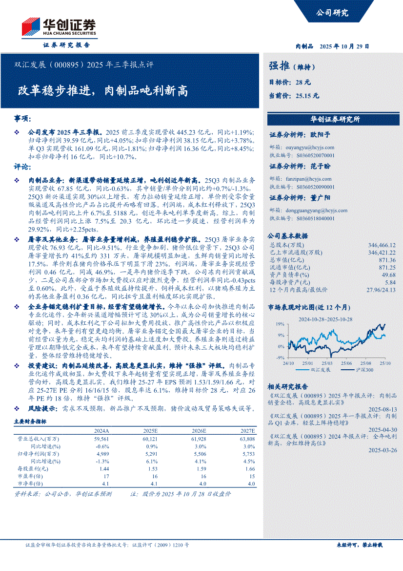 双汇发展:华创证券-双汇发展-000895-2025年三季报点评:改革稳步推进,肉制品吨利新高-251029