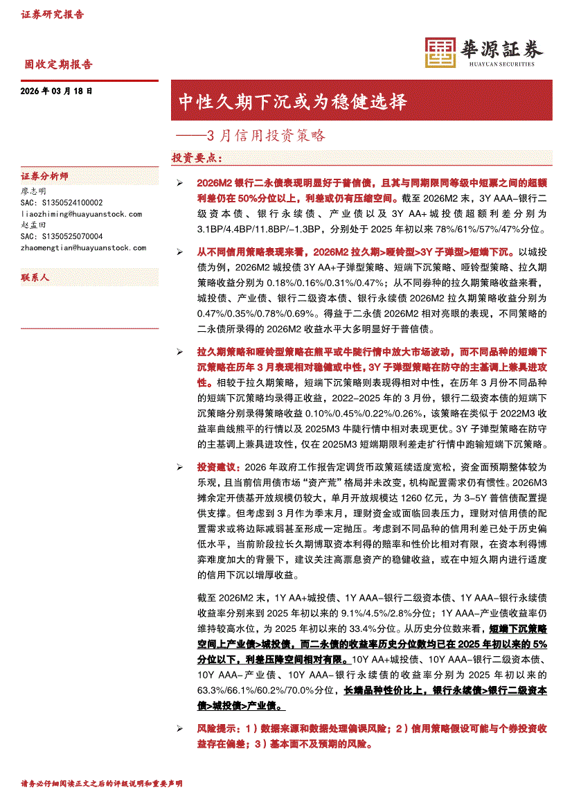 华源证券-3月信用投资策略:中性久期下沉或为稳健选择-260318