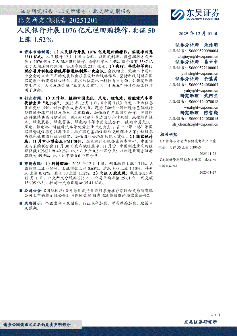 东吴证券-北交所定期报告:人民银行开展1076亿元逆回购操作,北证50上涨1.52%-251201