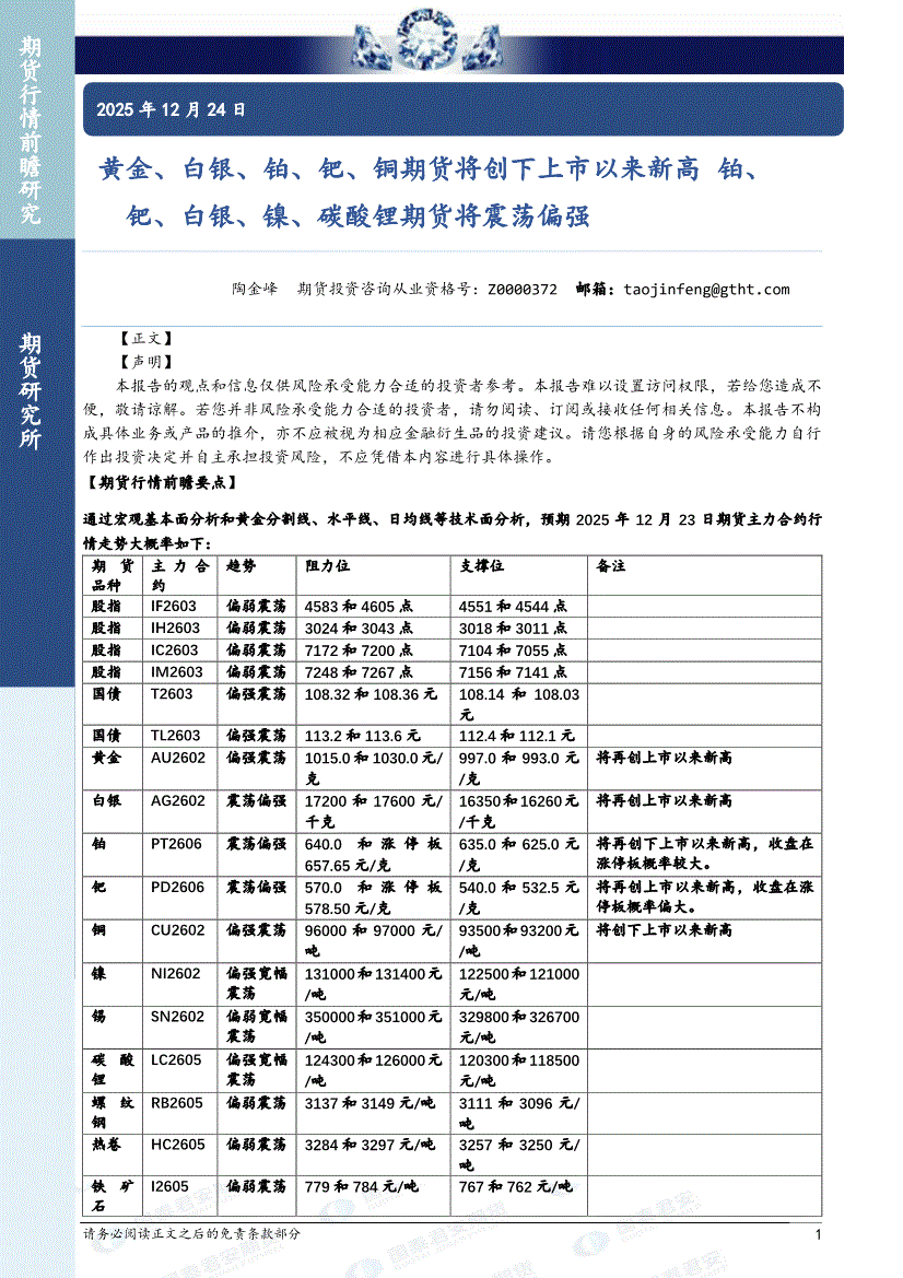 国泰君安期货-黄金、白银、铂、钯、铜期货将创下上市以来新高,铂、钯、白银、镍、碳酸锂期货将震荡偏强-251224