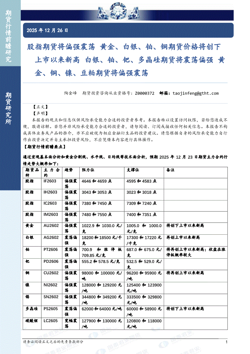 国泰君安期货-股指期货将偏强震荡,黄金、白银、铂、铜期货价格将创下上市以来新高,白银、铂、钯、多晶硅期货将震荡偏强,黄金、铜、镍、豆粕期货将偏强震荡-251226