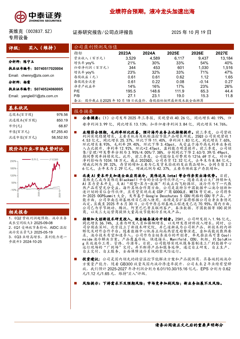英维克:中泰证券-英维克-002837-业绩符合预期,液冷龙头加速出海-251019