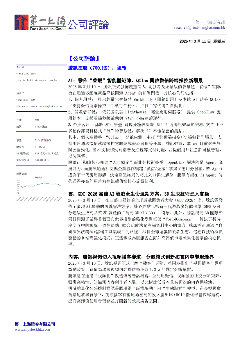 腾讯控股:第一上海-腾讯控股-0700.HK-周报-260311