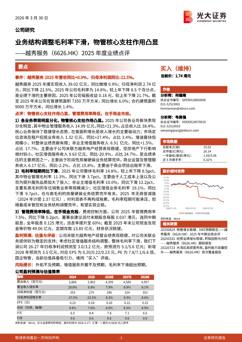 越秀服务:光大证券-越秀服务-6626.HK-2025年度业绩点评:业务结构调整毛利率下滑,物管核心支柱作用凸显-260330