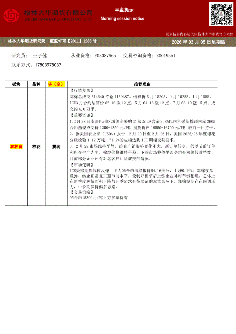 格林大华期货-早盘提示~棉花-260305