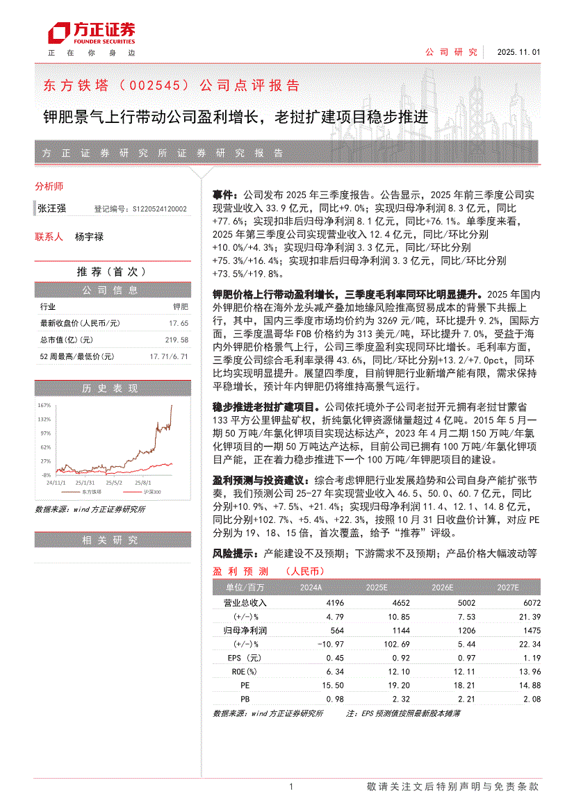 东方铁塔:方正证券-东方铁塔-002545-公司点评报告:钾肥景气上行带动公司盈利增长,老挝扩建项目稳步推进-251101