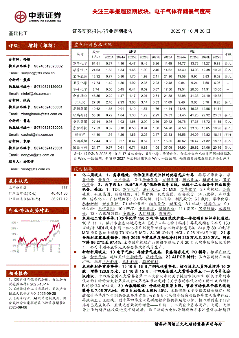 基础化工行业:中泰证券-基础化工行业:关注三季报超预期板块,电子气体存储景气度高-251020