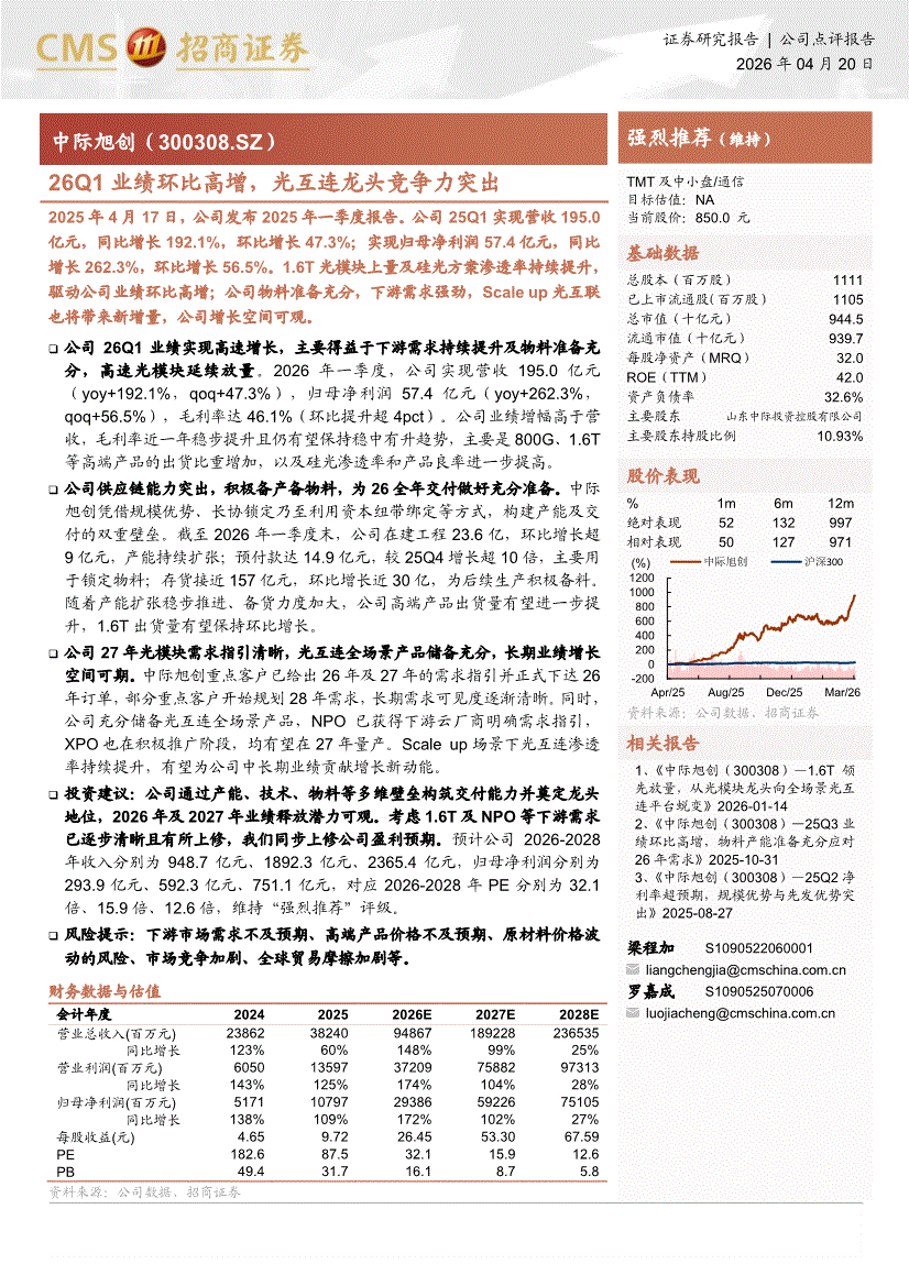 中际旭创:招商证券-中际旭创-300308-26Q1业绩环比高增,光互连龙头竞争力突出-260420
