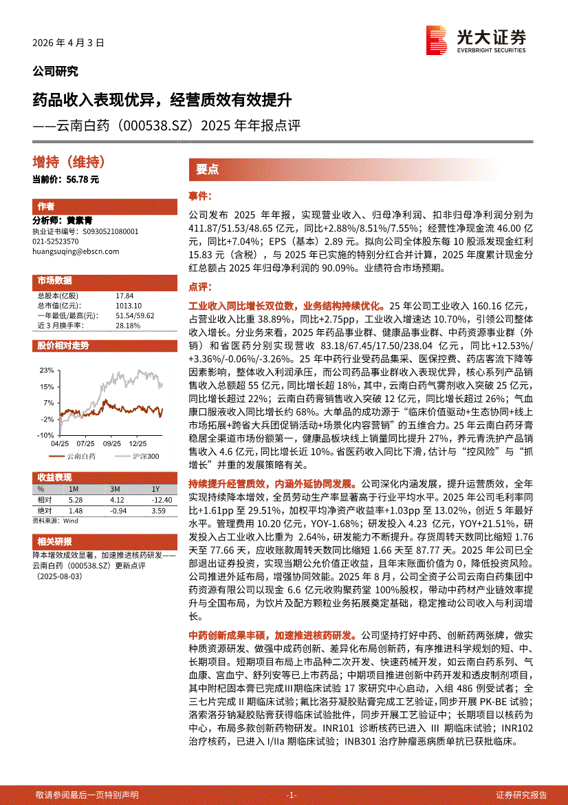 云南白药:光大证券-云南白药-000538-2025年年报点评:药品收入表现优异,经营质效有效提升-260403