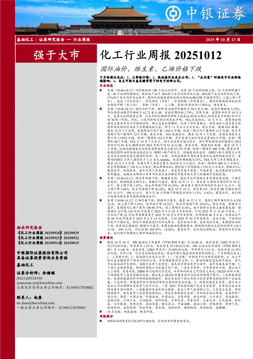 化工行业:中银国际-化工行业周报:国际油价、维生素、乙烯价格下跌-251013