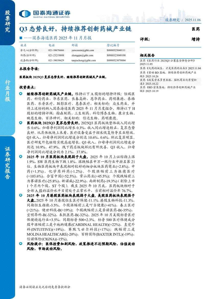 医药行业:国泰海通证券-医药行业2025年11月月报:Q3态势良好,持续推荐创新药械产业链-251106