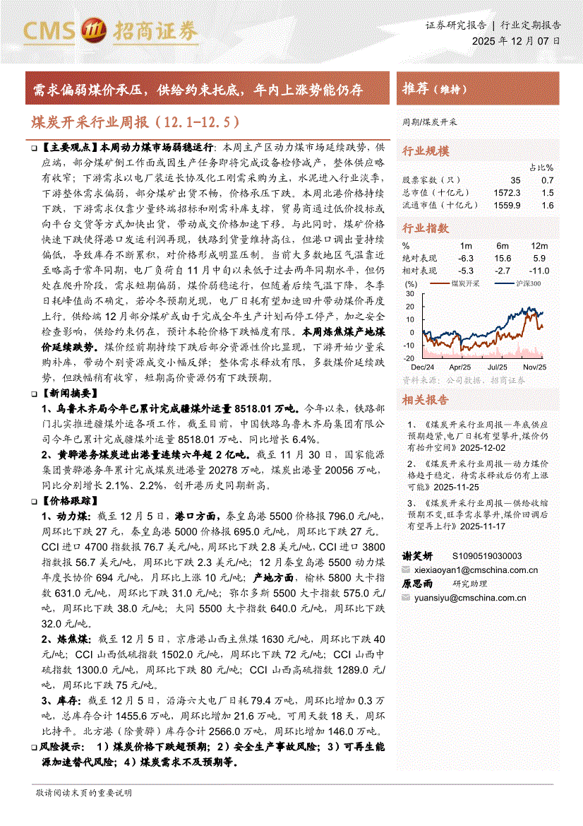 煤炭开采行业:招商证券-煤炭开采行业周报:需求偏弱煤价承压,供给约束托底,年内上涨势能仍存-251207