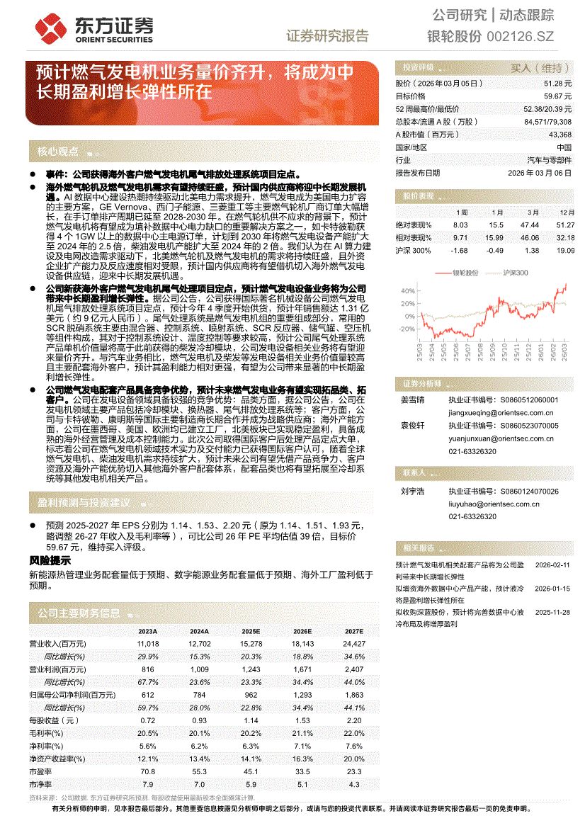 银轮股份:东方证券-银轮股份-002126-预计燃气发电机业务量价齐升,将成为中长期盈利增长弹性所在-260306