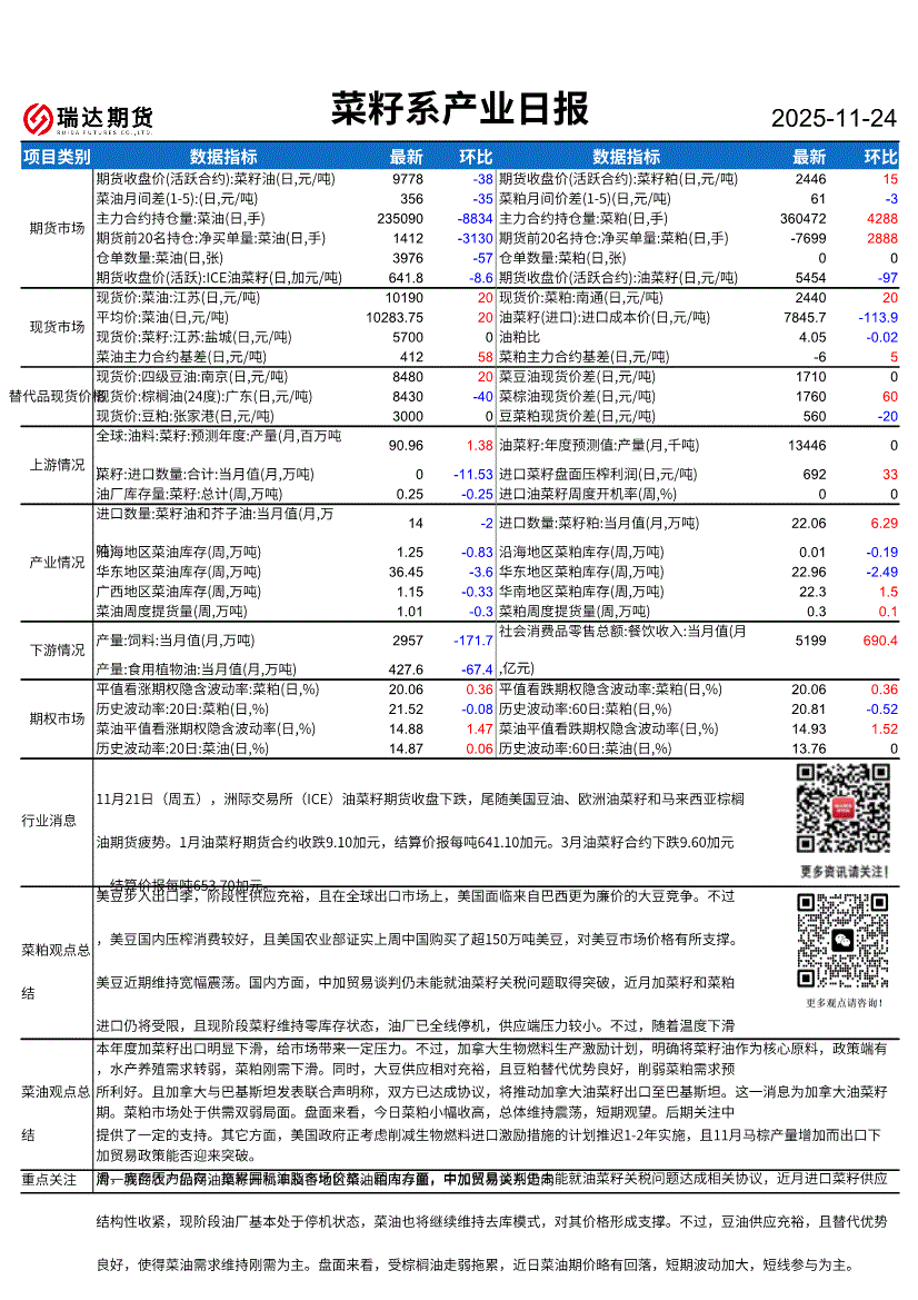 瑞达期货-菜籽类市场周报:外围油脂走弱影响,拖累菜油高位回落-251121