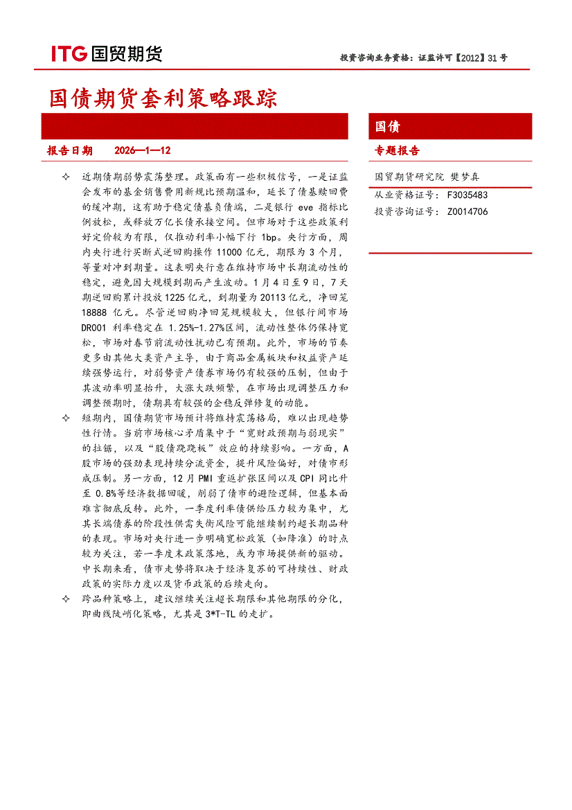 国贸期货-国债期货套利策略跟踪-260112