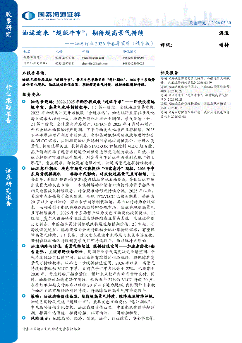 油运行业:国泰海通证券-油运行业2026年春季策略(精华版):油运迎来“超级牛市”,期待超高景气持续-260330