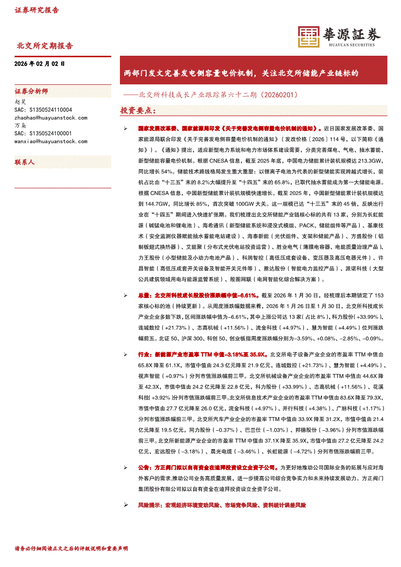 华源证券-北交所科技成长产业跟踪第六十二期:两部门发文完善发电侧容量电价机制,关注北交所储能产业链标的-260202