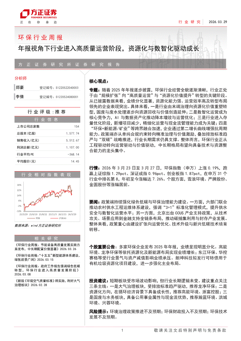 环保行业:方正证券-环保行业周报:年报视角下行业进入高质量运营阶段,资源化与数智化驱动成长-260329
