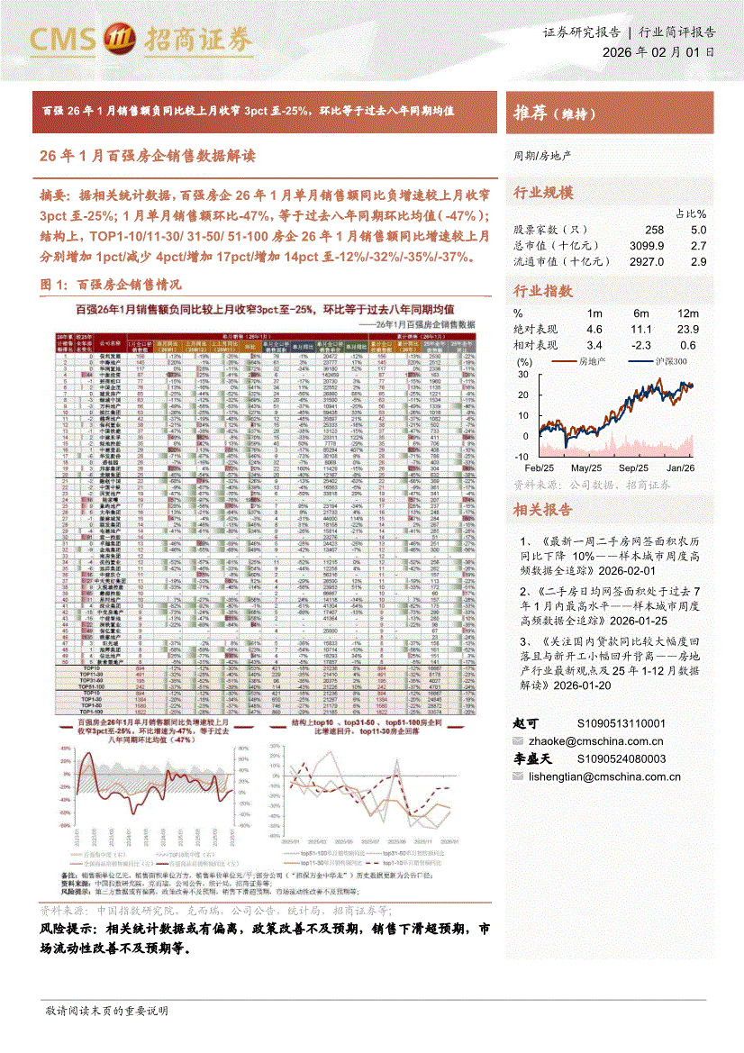 房地产行业:招商证券-房地产行业26年1月百强房企销售数据解读:百强26年1月销售额负同比较上月收窄3pct至负25%,环比等于过去八年同期均值-260201