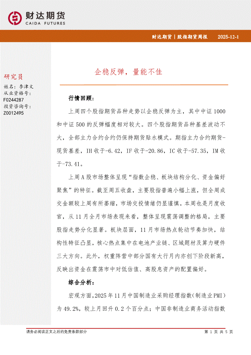 财达期货-股指期货周报:企稳反弹,量能不佳-251201