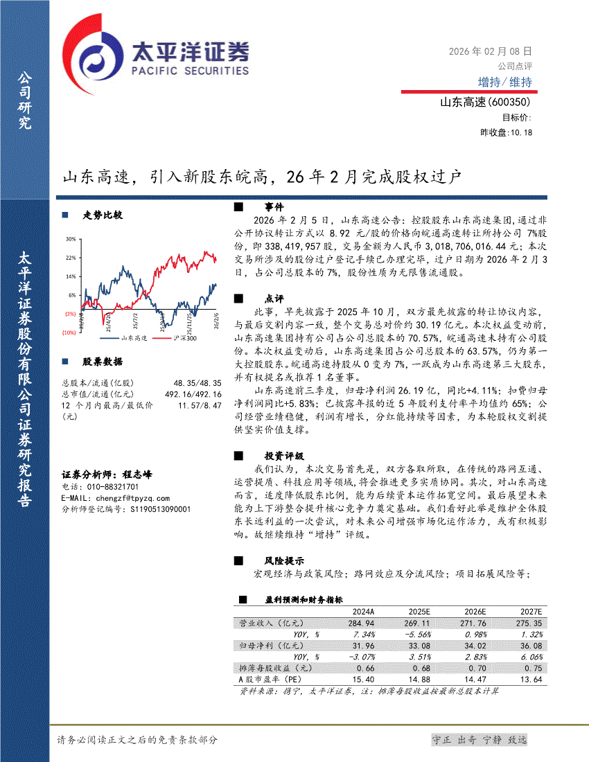 山东高速:太平洋证券-山东高速-600350-山东高速,引入新股东皖高,26年2月完成股权过户-260208