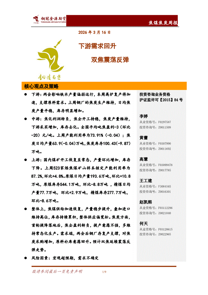 铜冠金源期货-焦煤焦炭周报:下游需求回升,双焦震荡反弹-260316