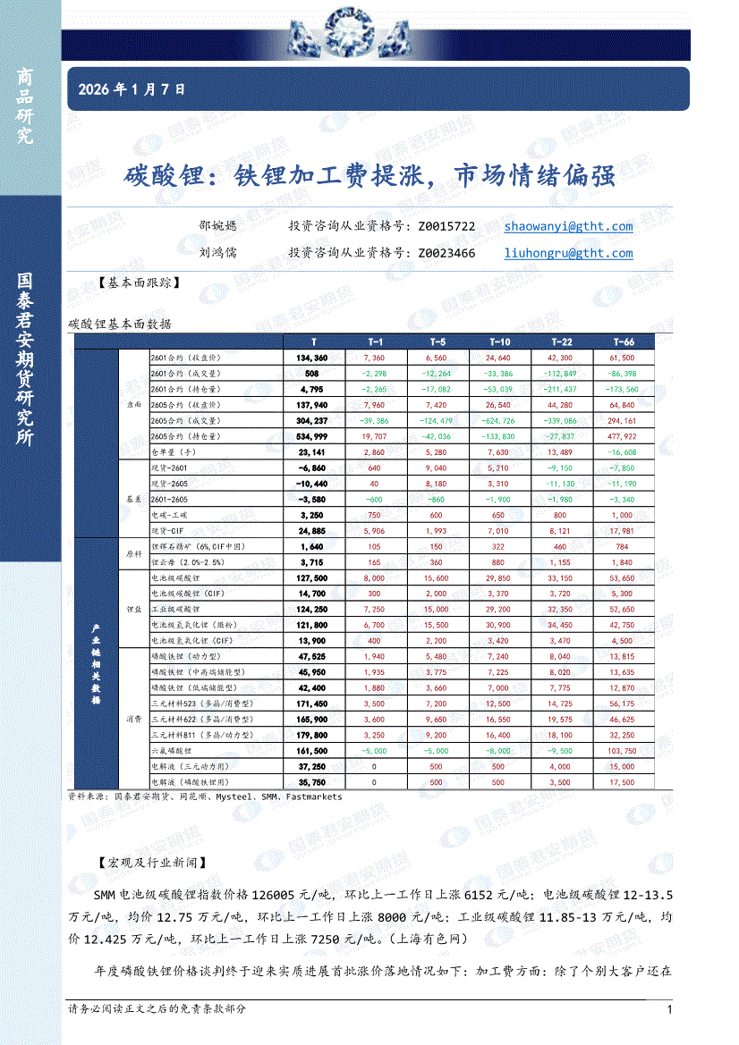 国泰君安期货-碳酸锂:铁锂加工费提涨,市场情绪偏强-260107