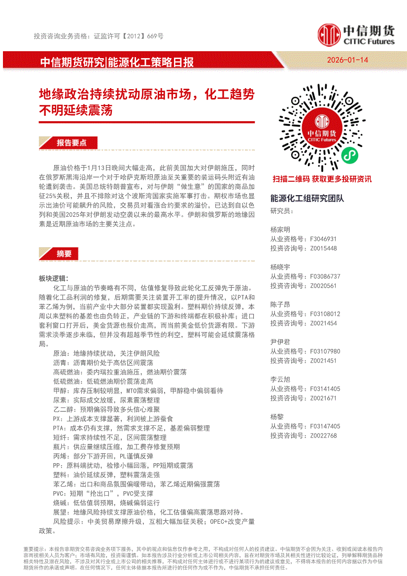 中信期货-能源化工策略日报:地缘政治持续扰动原油市场,化工趋势不明延续震荡-260114