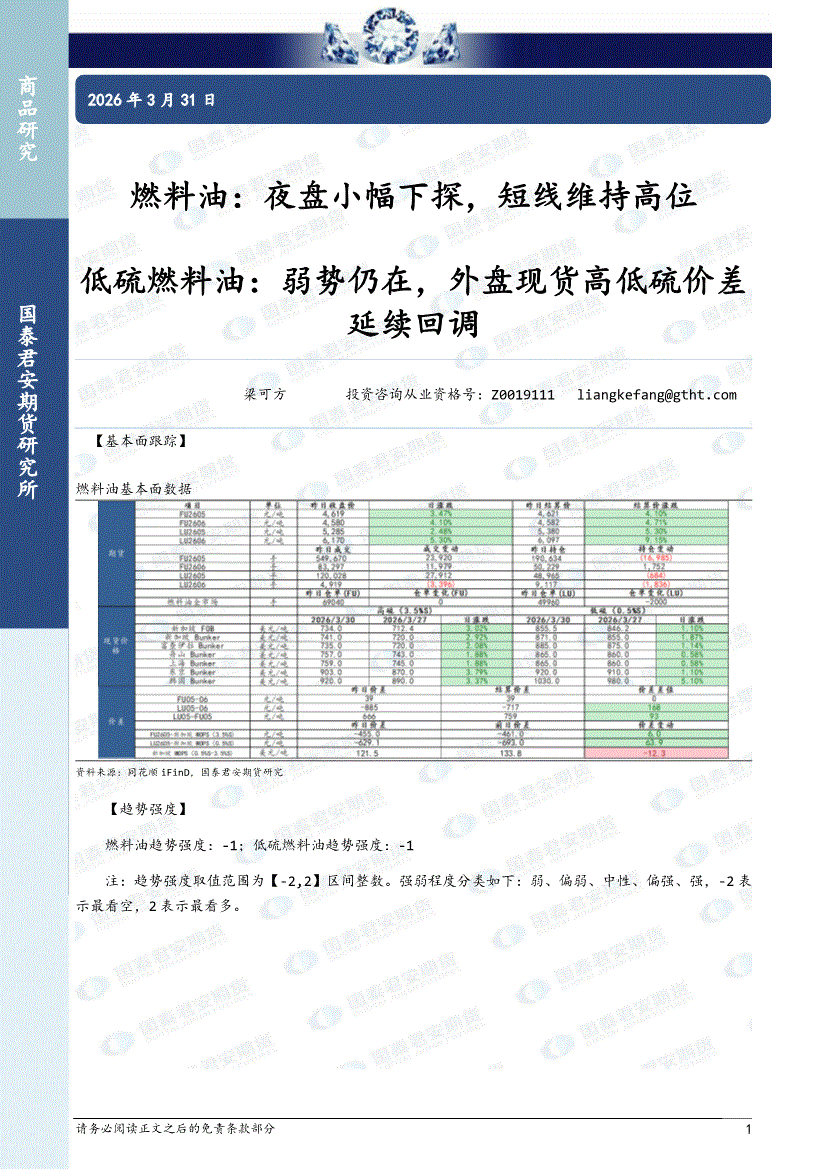 国泰君安期货-燃料油:夜盘小幅下探,短线维持高位,低硫燃料油,弱势仍在,外盘现货高低硫价差延续回调-260331