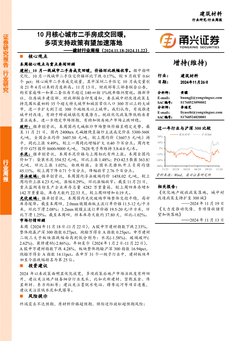 建材行业:甬兴证券-建材行业周报:10月核心城市二手房成交回暖,多项支持政策有望加速落地-241126