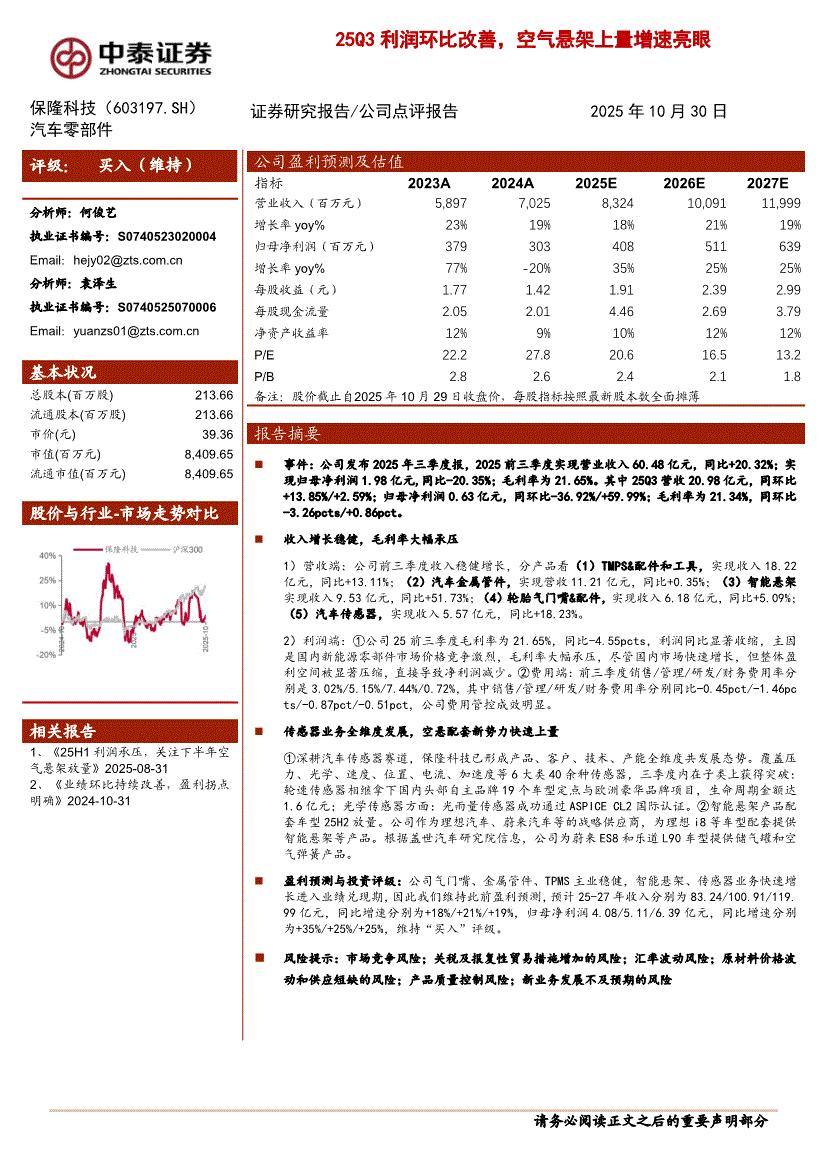 保隆科技:中泰证券-保隆科技-603197-25Q3利润环比改善,空气悬架上量增速亮眼-251030