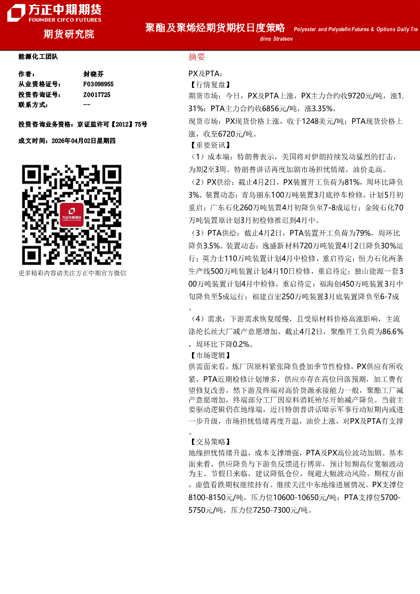 方正中期期货-聚酯及聚烯烃期货期权日度策略-260402