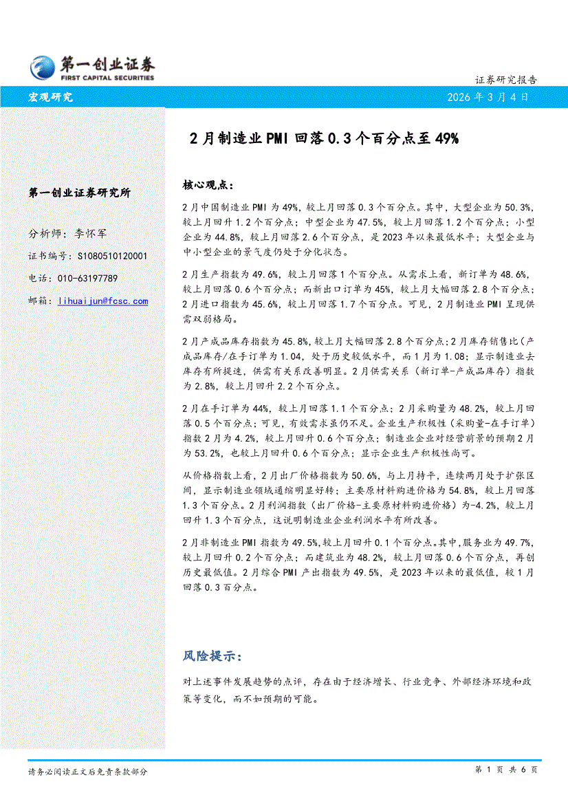 第一创业-2月制造业PMI回落0.3个百分点至49%-260304
