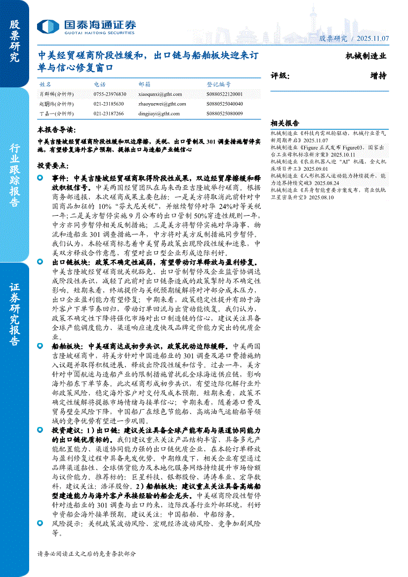 机械制造行业:国泰海通证券-机械制造行业:中美经贸磋商阶段性缓和,出口链与船舶板块迎来订单与信心修复窗口-251107