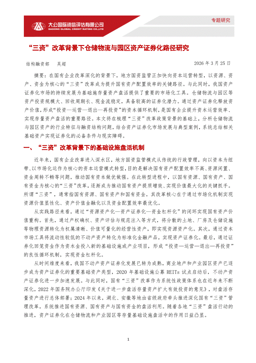 大公国际-“三资”改革背景下仓储物流与园区资产证券化路径研究-260325