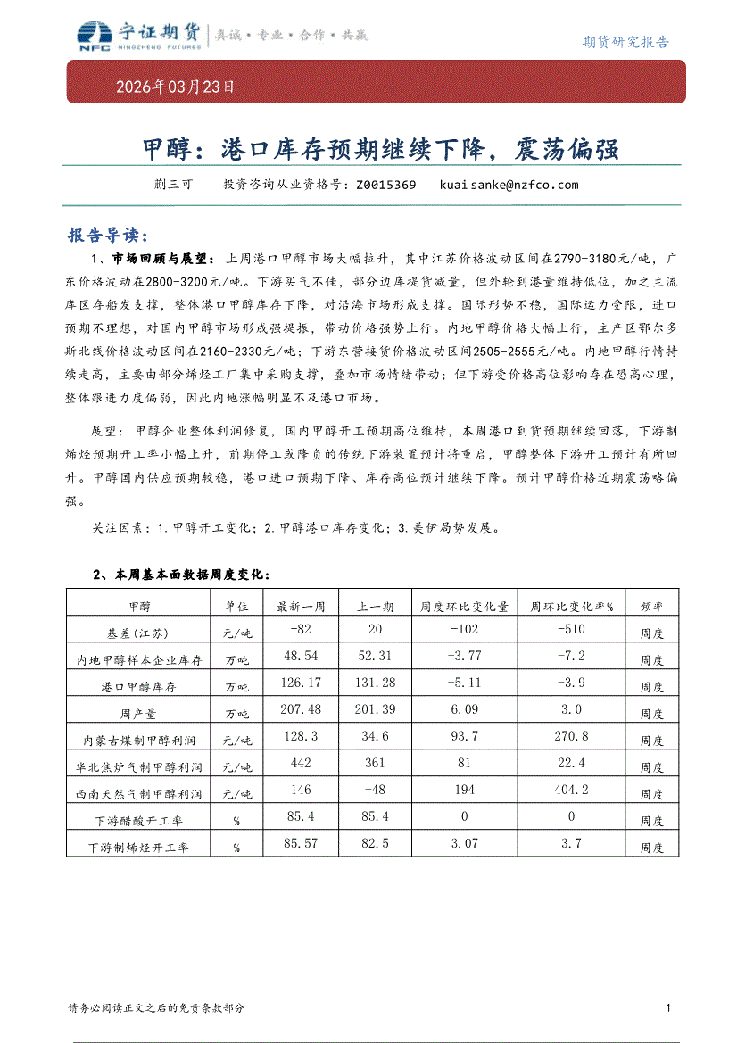 宁证期货-甲醇:港口库存预期继续下降,震荡偏强-260323