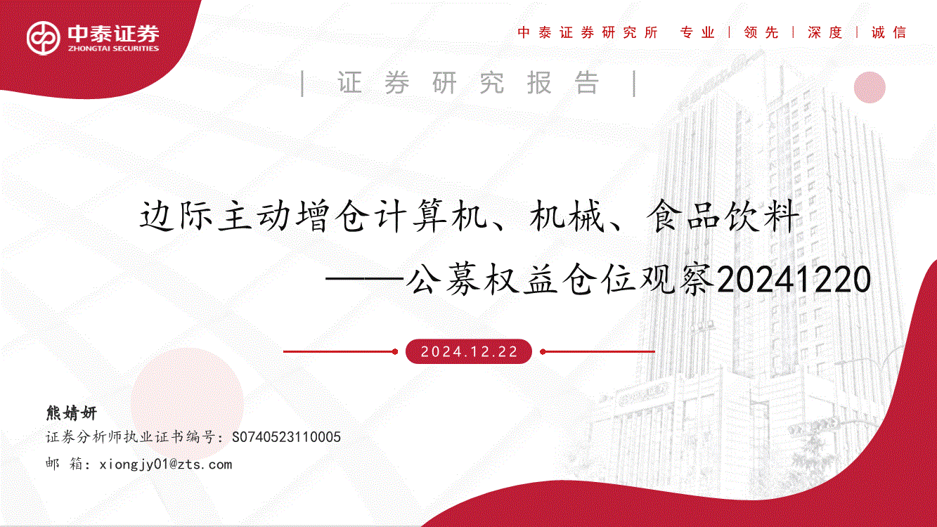 中泰证券-公募权益仓位观察:边际主动增仓计算机、机械、食品饮料-241222