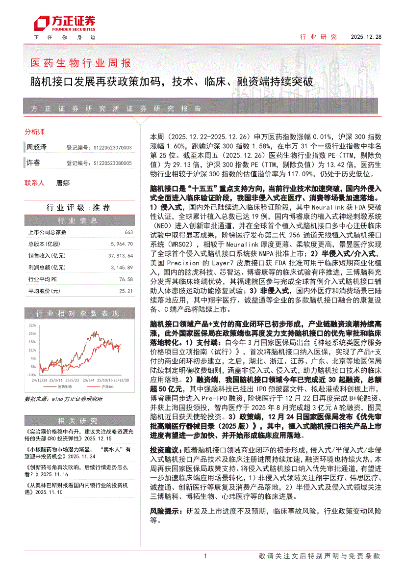 医药生物行业:方正证券-医药生物行业周报:脑机接口发展再获政策加码,技术、临床、融资端持续突破-251228