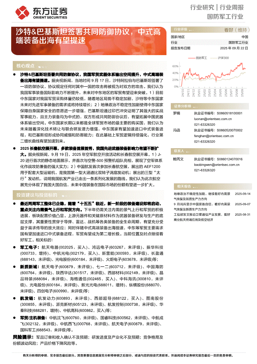 国防军工行业:东方证券-国防军工行业周报:沙特&巴基斯坦签署共同防御协议,中式高端装备出海有望提速-250922